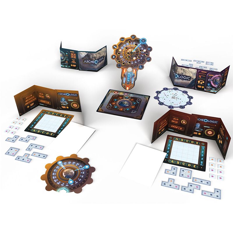 To help you? An Archeoscope, the only research instrument capable of reading the coded cards left by the Ancients. Ask the Archeoscope your questions by adjusting its cogs, note the precious answers, and replace the buildings on your plan. Think carefully as some questions will take more time than others, but maybe their answer will help you win...
