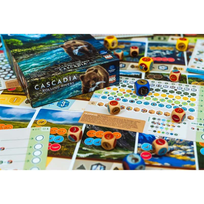 Cascadia: Rolling is a series of puzzly flip-and-roll-and-write games featuring the habitats and wildlife of the Pacific Northwest! Simultaneously roll dice, collect wildlife, and complete habitat cards to fill in different environments in Cascadia. Use special actions to manipulate your dice, and dynamic completion cards to unlock powerful combos!