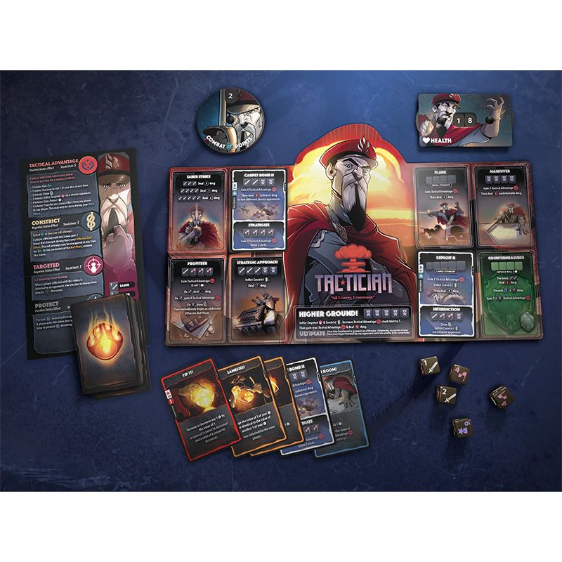 - Натрупвай Combat Points: Изразходвай точките си за карти с широк спектър от ефекти – от перманентни подобрения (upgrades) до манипулиране на заровете (твоите, на съотборниците ти или дори тези на опонента!).