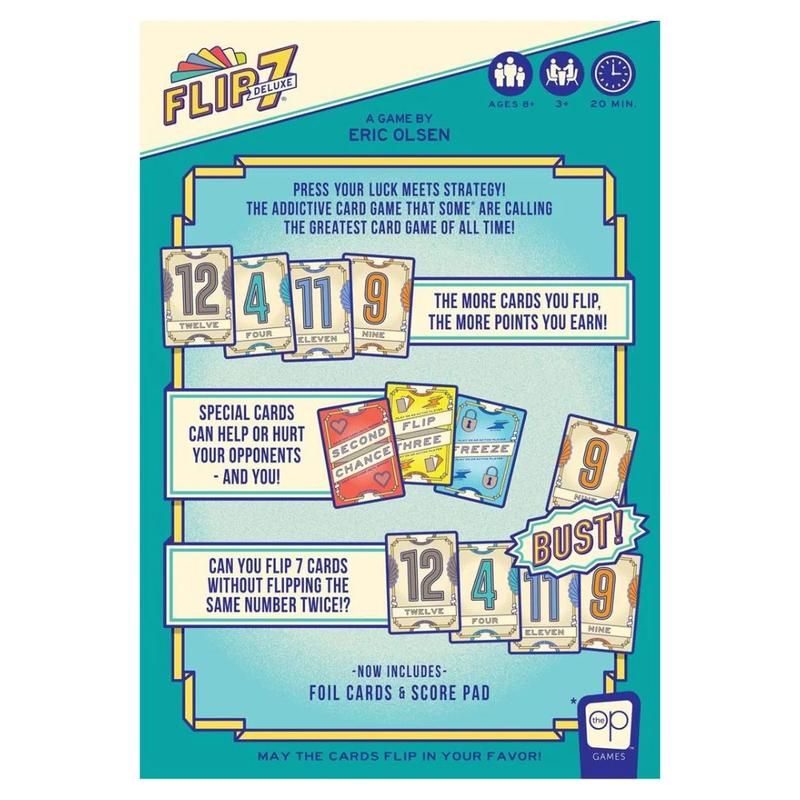 Sound easy? Think again! This isn’t just any deck of cards… In Flip 7 Deluxe there's only one 1 card, two 2's, three 3’s, and so on, plus a set of powerful special cards that can score you extra points, give you a second chance, or freeze you or your opponents in your tracks.