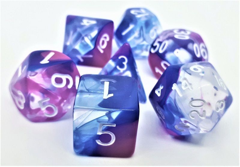 7-piece polyhedral RPG dice set consisting of the typical and relevant RPG dice: D4, D6, D8, D10 (0-9), D10 (00-90), D12 and D20.