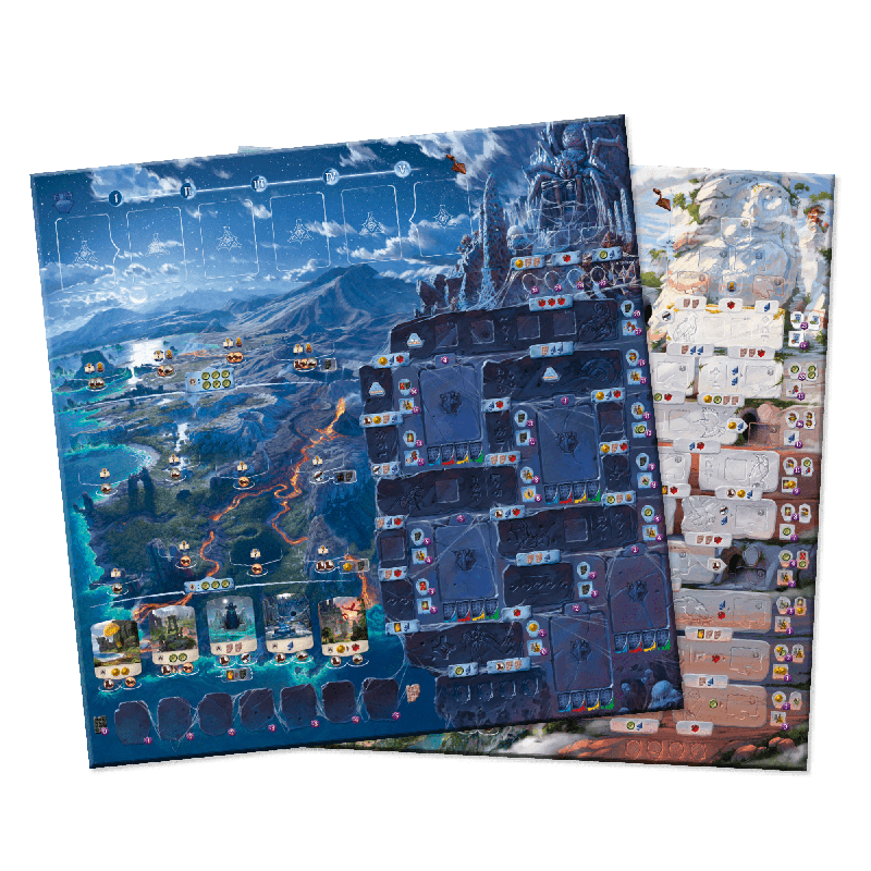 On the map, you can choose to explore its daytime side and scale the white stone of the Owl Temple. It uses unique new temple tiles that, if combined together, can become extra idol slots, and a third research token, a lantern, that brings even stronger research rewards. You can also brave the night and journey through the dark caverns of the Spider Temple. This side uses a new resource, dark tablets, used to invoke mysterious altars and place artifacts directly onto the research track to be used when ascending the track. But beware—using the dark tablets can give you strong rewards, but also cost you points should you become too ambitious!