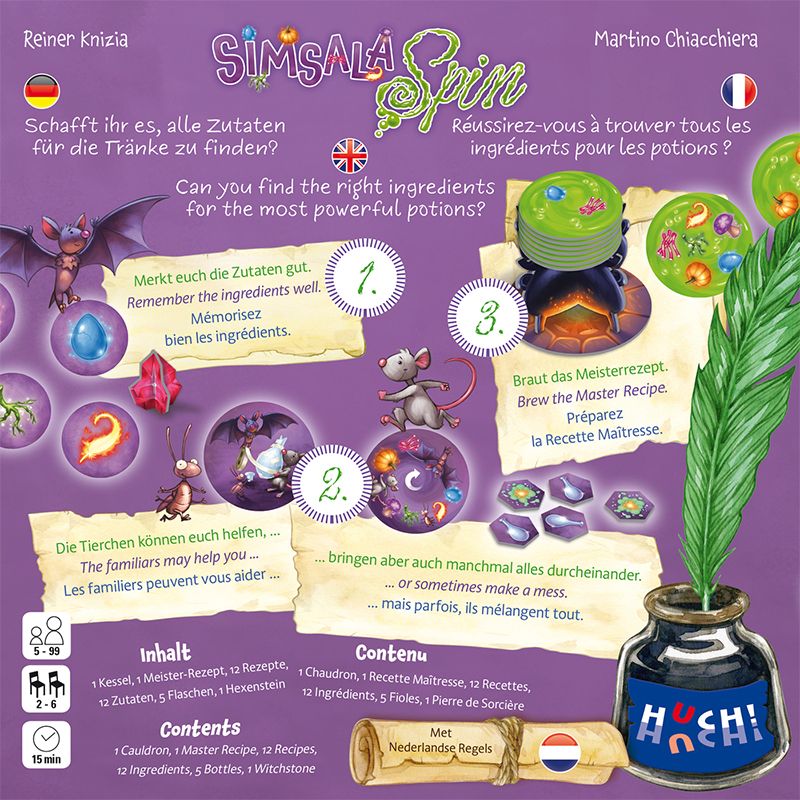 Simsala Spin е детска кооперативна настолна игра, в която играчите стават млади магьосници и работят заедно, за да приготвят вълшебни отвари. Играчите трябва да откриват и запомнят разположението на съставките, за да изпълнят рецептите. Играта развива паметта и концентрацията и предлага забавна и лесна за разбиране магическа тематика, подходяща за деца и семейства.