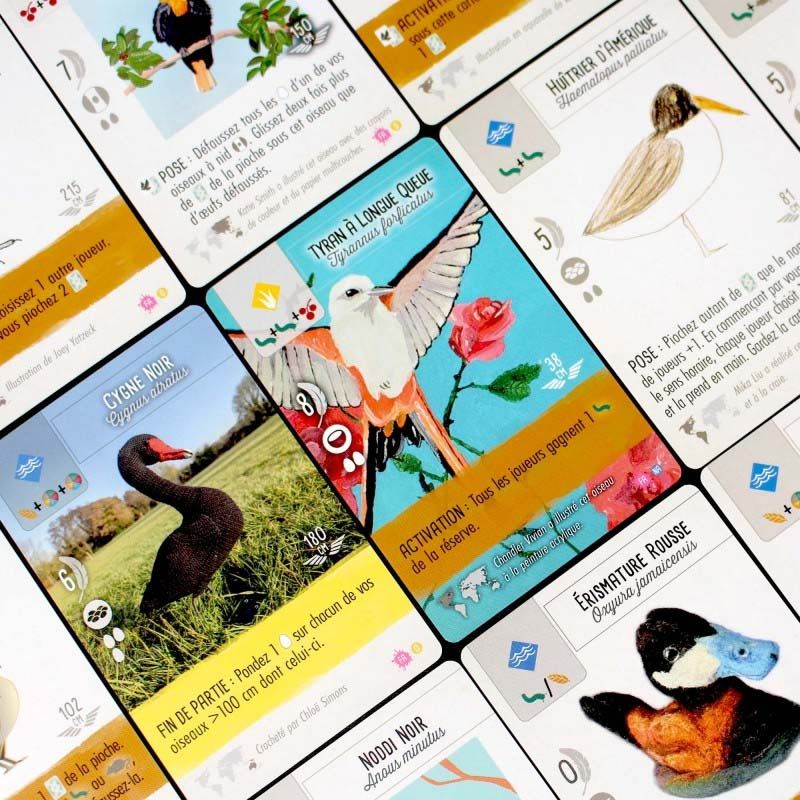 The box for the cards is designed both for storage and recyclability; it will fit in the bottom layer of the Nesting Box. You can shuffle the cards into your standard Wingspan set, select some cards to replace the cards you have (there are 446 total unique bird cards in Wingspan compared to 255 fan-art birds), or play games only with these birds (their percentages correspond closely to those noted on bonus cards).