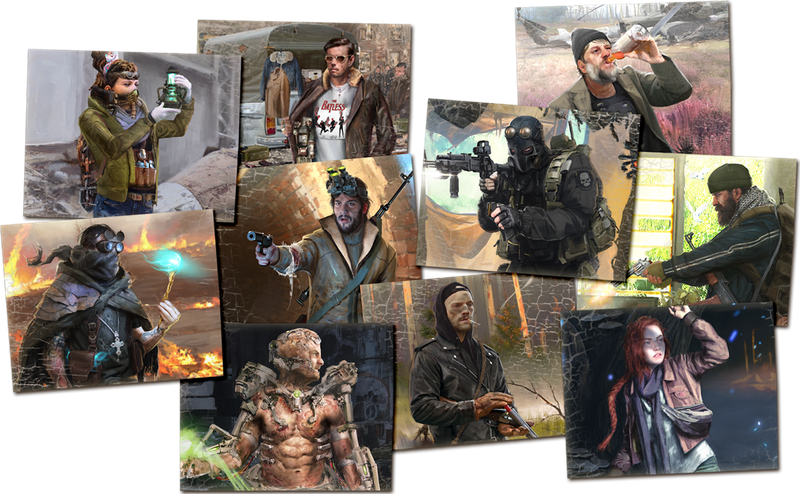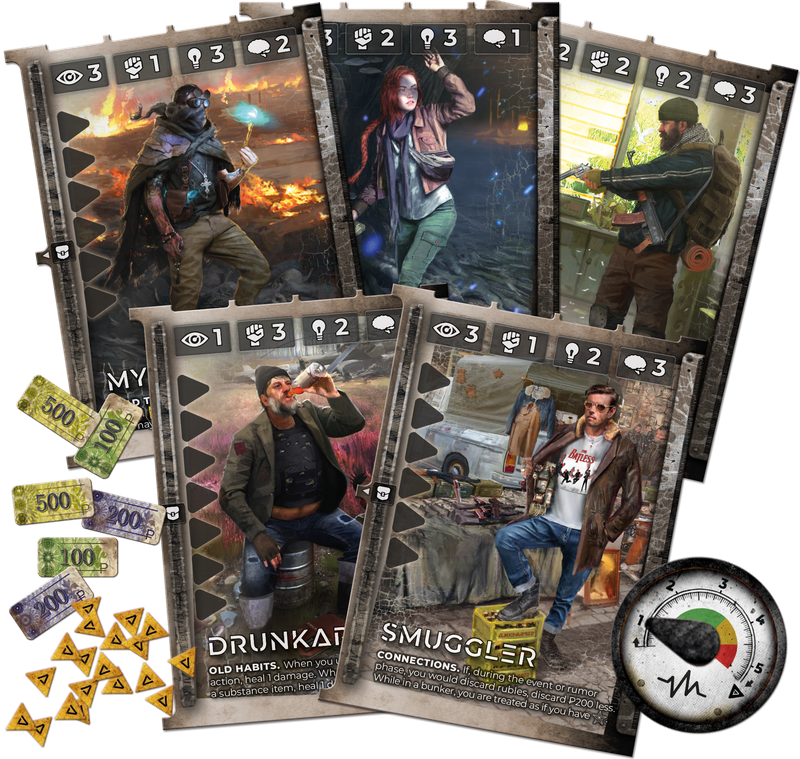 Each player takes role of 1 Scavenger from the 10 included in the game. Each Scavenger has their own Special Skill, set of basic Skills and starting equipment. Values of stats such as Awareness, Agility or Intellect determine how good they are in avoiding dangers and traps, fighting mutants or gathering Artifacts from anomalies. The story of Scavenger explains his/herPersonal Goal – the reason for arriving to the Zone. Differences between Scavengers makes playing each one of them completely unique.