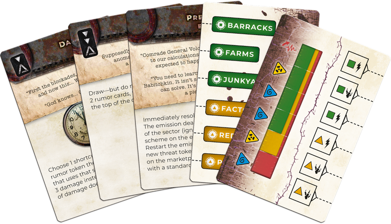 This board game emphasizes the aspect of survival. Zone depicted on the playing board is an extremely hazardous and isolated area with very limited access to functional equipment and supplies. Players must remember to frequently repair their Items and buy new ones. It is also crucial to rest to reduce Fatigue and heal Damage.